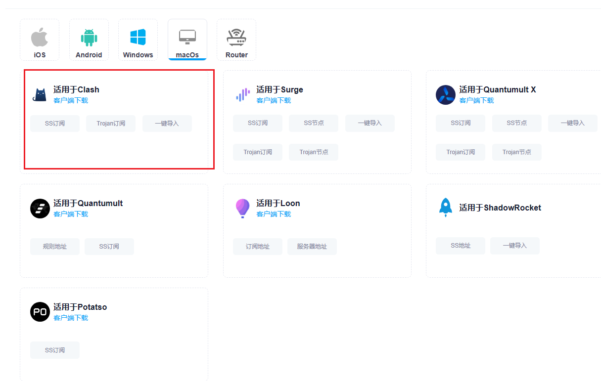 2.点击“查看详情”，进入服务详细界面，点击“MacOS客户端”–>“复制订阅”（两个订阅任选其一，并无区别）。
