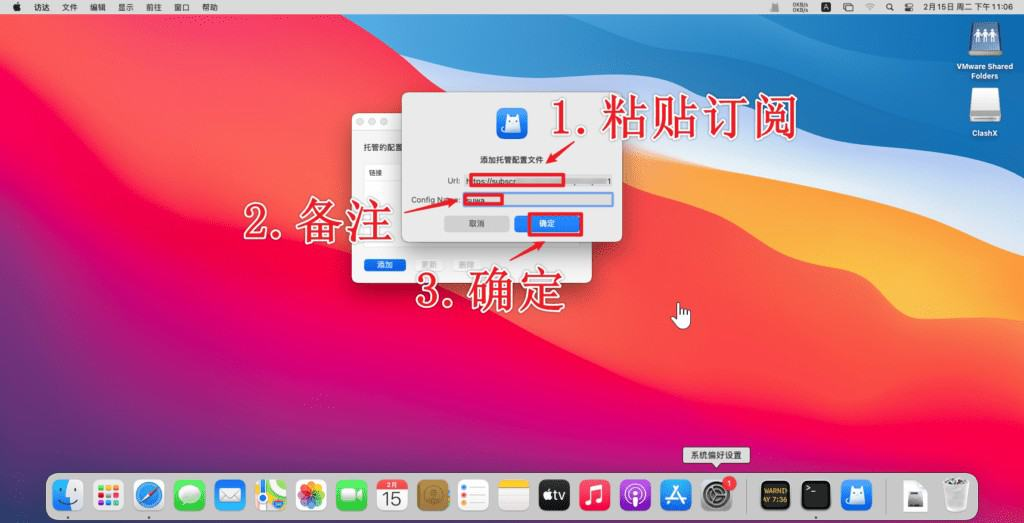 4.在托管的配置文件窗口，点击 “添加” 在 Url 一栏中输入 Clash 配置订阅链接，Config Name 为配置文件名，可以随意命名。