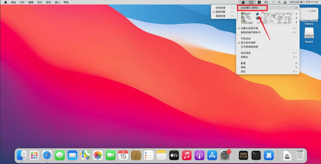 点击右上方系统托盘的ClashX图标,**出站模式**根据自己的需求切换